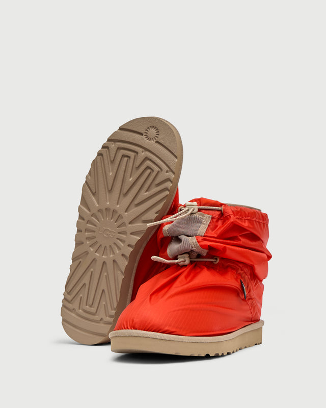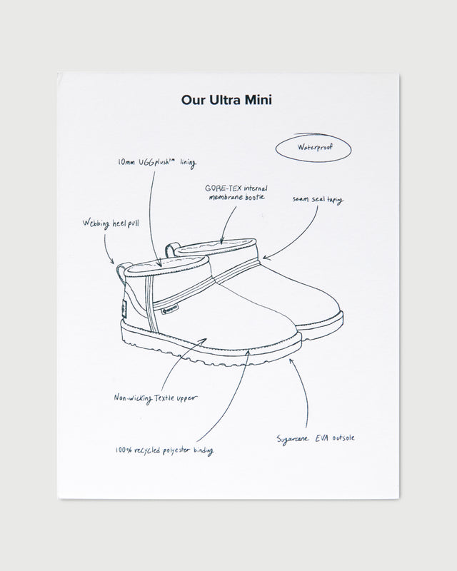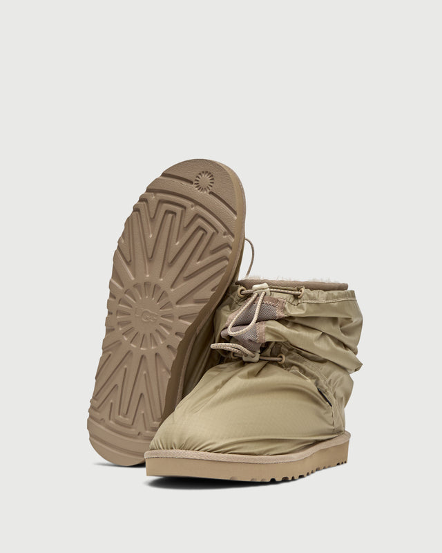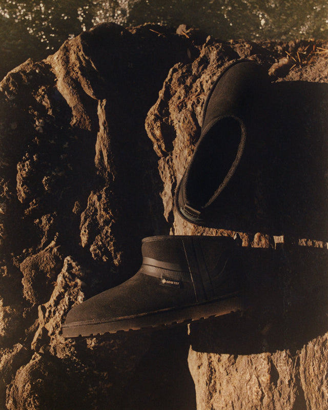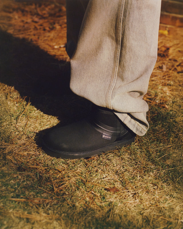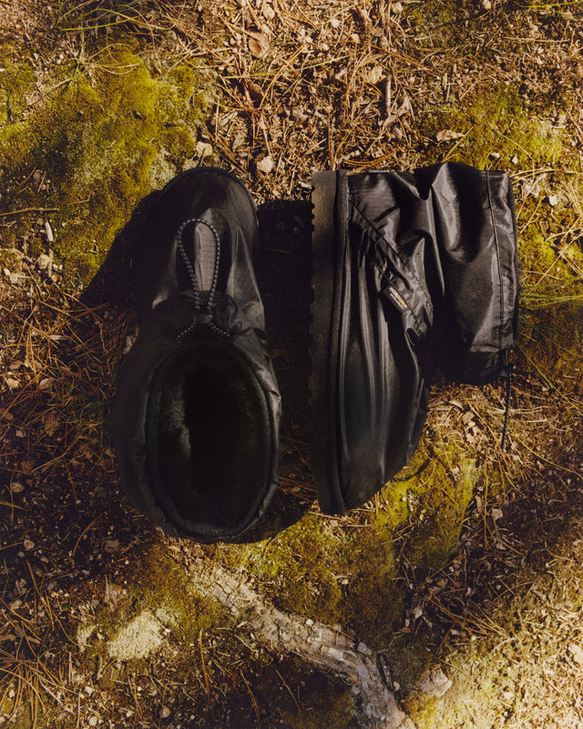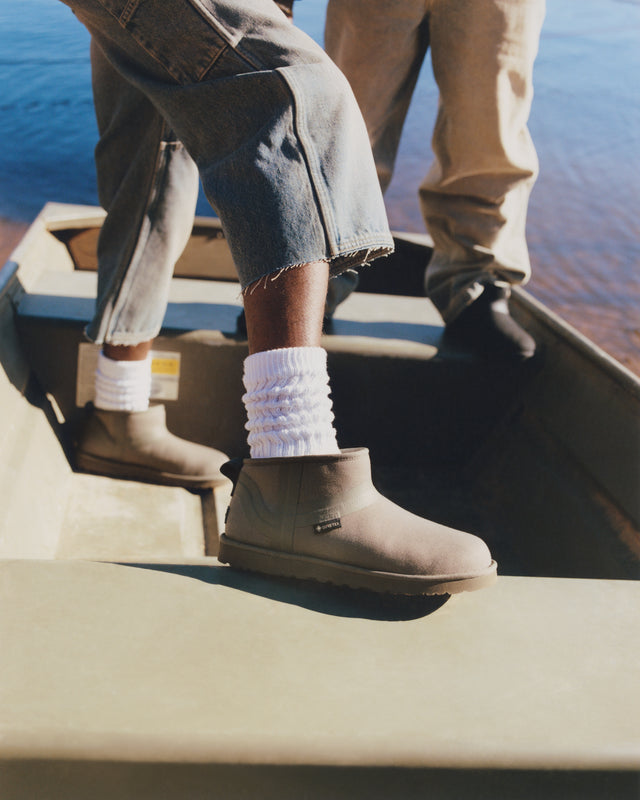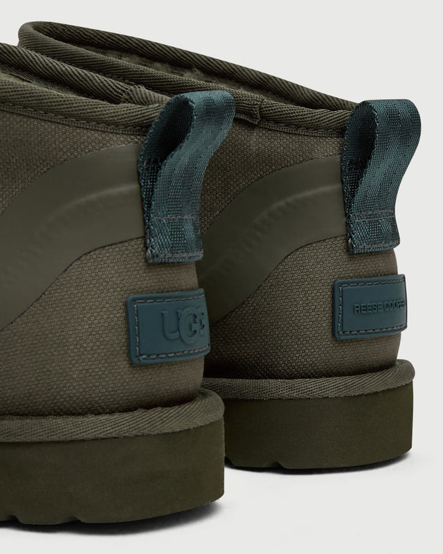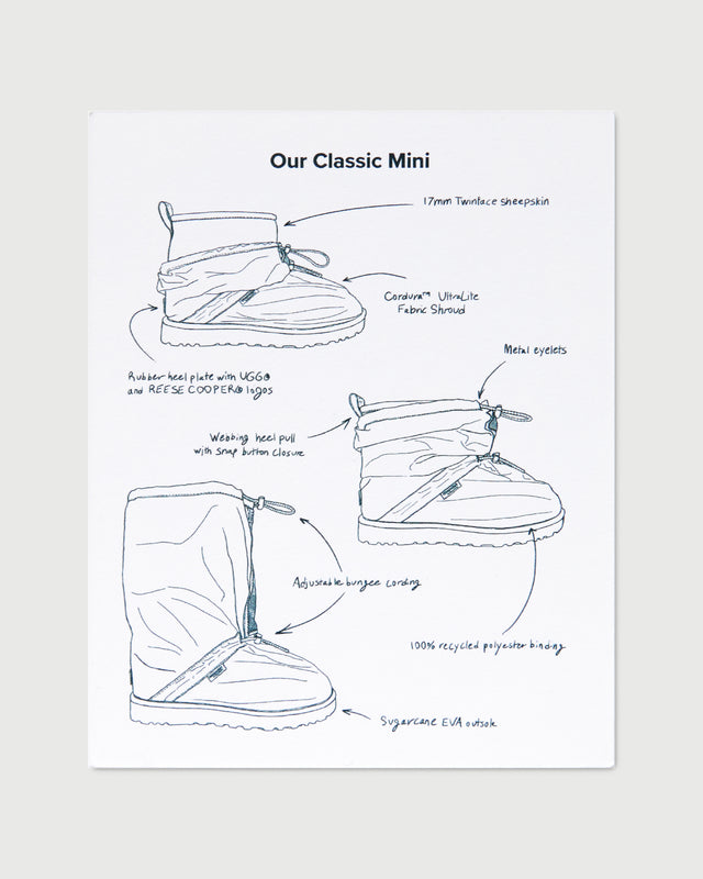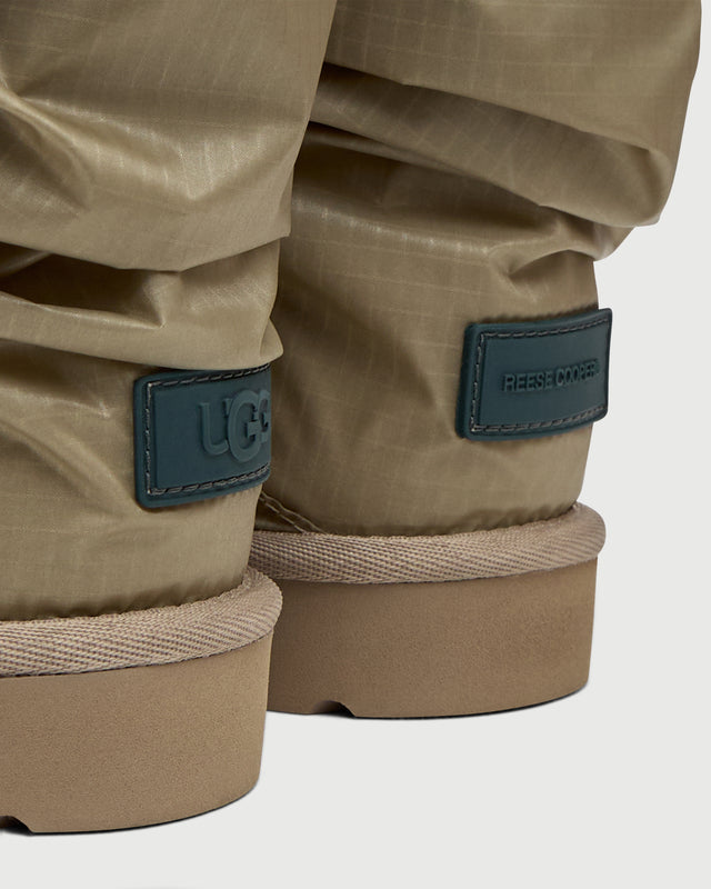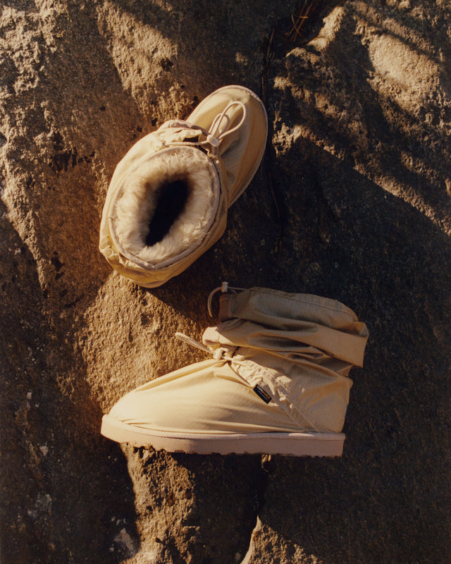 The RCI take on the UGG Classic Mini. A twinface sheepskin boot with an adjustable Cordura™ UltraLite shroud covering the boot for weather resistance. The shroud can be worn up or down, with a snap button securing it in place when down, and fully adjustable with bungee cording. The boot is finished with a Sugarcane EVA outsole & dual rubber patches with the REESE COOPER® & UGG® logos.